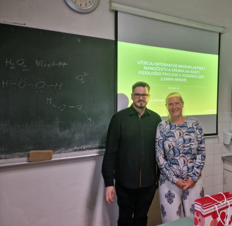 U okviru projekta MINION izrađen je novi diplomski rad. U srijedu 23. rujna 2025. diplomirao je David Bendelja, student Integriranog prijediplomskog i diplomskog studija biologije i kemije, s diplomskim radom pod naslovom „UTJECAJ INTERAKCIJE MIKROPLASTIKE I NANOČESTICA SREBRA NA RAST I FIZIOLOŠKE PROCESE U VODENOJ LEĆI (Lemna minor)“ pod mentorstvom prof. dr. sc. Mirte Tkalec.