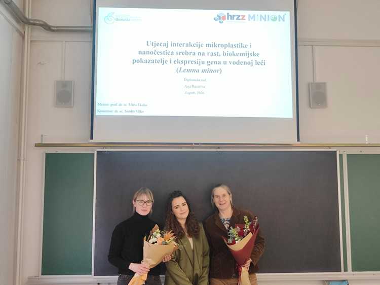 The new thesis was completed as part of the MINION project. On Thursday, 5 February 2026, Ana Bazarota, a student of the Graduate Study of Experimental Biology, completed her studies and graduated with a dissertation entitled "The impact of microplastic and silver nanoparticles interaction on growth, biochemical indicators and gene expression in duckweed (Lemna minor)" under the supervision of Prof. Mirta Tkalec, PhD, and the co-supervision of Sandra Vitko, PhD.