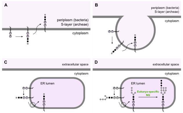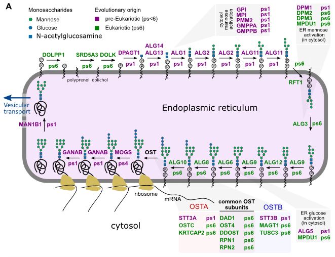 Primjenom filostratigrafske metode, istraživači su također pratili podrijetlo više od 600 gena povezanih s glikozilacijom i tisuća njihovih glikoziliranih proteinskih ciljeva te je i ovdje uočen "binarni" evolucijski potpis: ključni geni za glikozilaciju potječu ili iz vremena posljednjeg univerzalnog zajedničkog pretka (LUCA), ili su se pojavili s nastankom eukariota, uz vrlo malo dodataka iz međufaza.