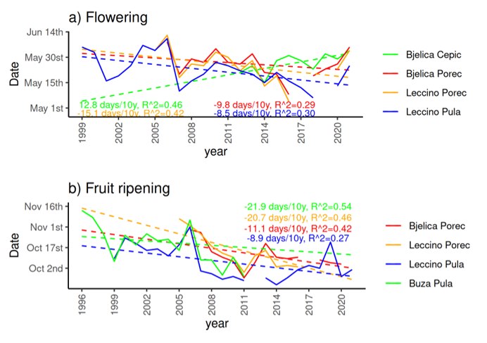 Budući da klimatske promjene značajno utječu na sve aspekte ljudskoga života, znanstvenici u Hrvatskoj šire njihovo proučavanje na nova područja. Tako su znanstvenici s Geofizičkog odsjeka, prof. dr. sc. Maja Telišman Prtenjak i dr. sc. Branimir Omazić, sudjelovali u istraživanju o utjecaju meteoroloških uvjeta na nastupe fenoloških faza masline u Istri. Istraživanje je provedeno pod vodstvom doc. dr. sc. Andreine Belušić Vozila s Fakulteta za fiziku Sveučilišta u Rijeci, a nekadašnje asistentice, i u suradnji sa znanstvenicima s Instituta za poljoprivredu i turizam, Instituta Ruđer Bošković i Instituta za jadranske kulture i melioraciju krša. Rezultati istraživanja nedavno su objavljeni u radu Assessing the Interplay Between Climatic Conditions and Olive Phenology Using the Growing Degree Day Model u cijenjenom časopisu International Journal of Climatology (Clarivate JIF = 2.8, Q3).