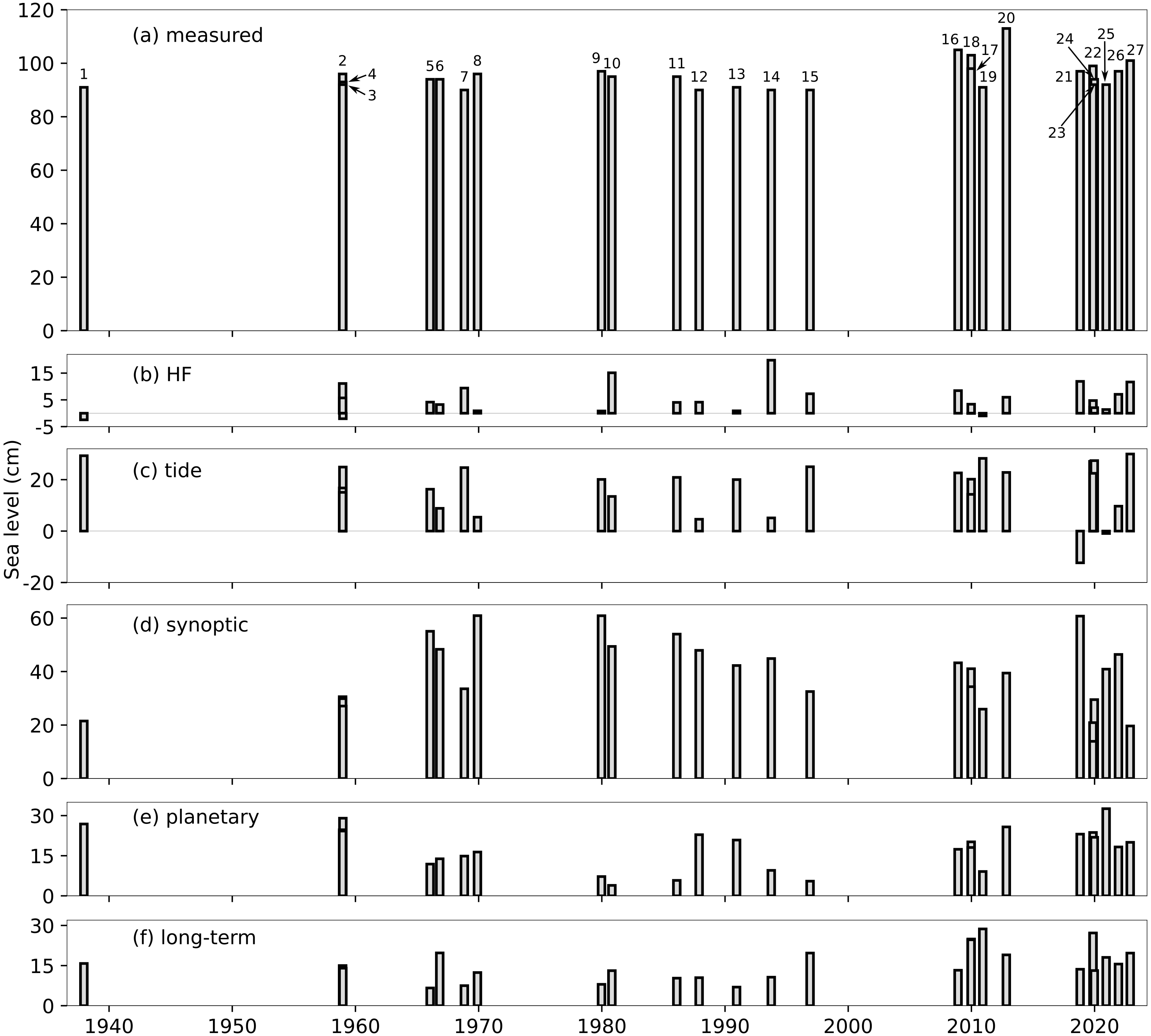 Za svaki poplavni događaj provedena je detaljna analiza meteorološke pozadine (na sinoptičkoj i planetarnoj skali) te su analizirane različite komponente razine mora: od visokofrekventnih procesa (primjerice seša s periodima od nekoliko sati) do procesa na dugim vremenskim skalama, poput multidekadske varijabilnosti i linearnog trenda porasta razine mora. Osim toga, za svaki događaj prikupljeni su podaci o relevantnim znanstvenim radovima te informacije o nastalim štetama duž cijele hrvatske obale Jadrana.