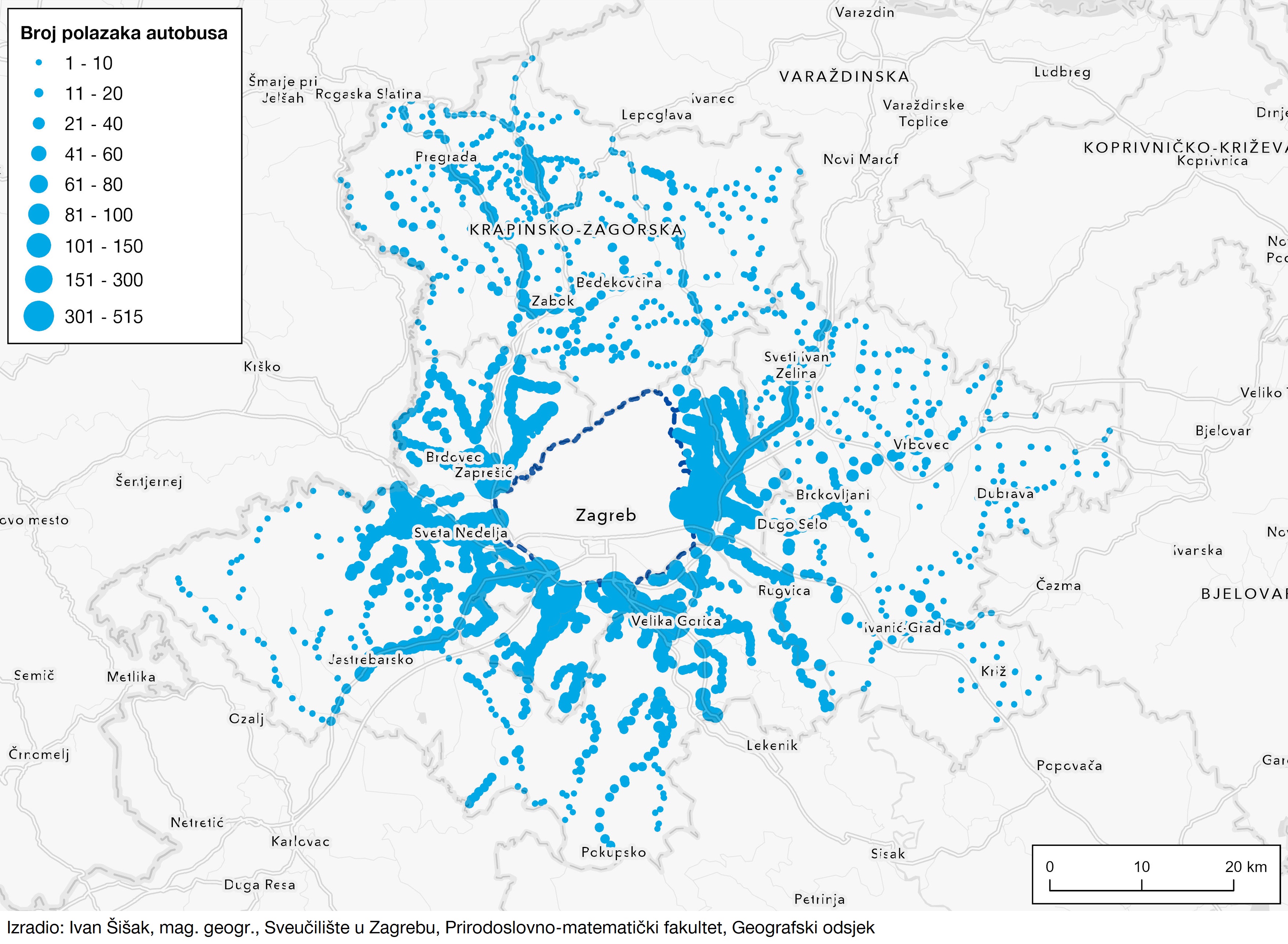 Broj dnevnih polazaka redovitih linija radnim danom po autobusnim stajalištima u Zagrebačkoj regiji izvan naselja Zagreb u lipnju 2023. godine. Izradio: I. Šišak