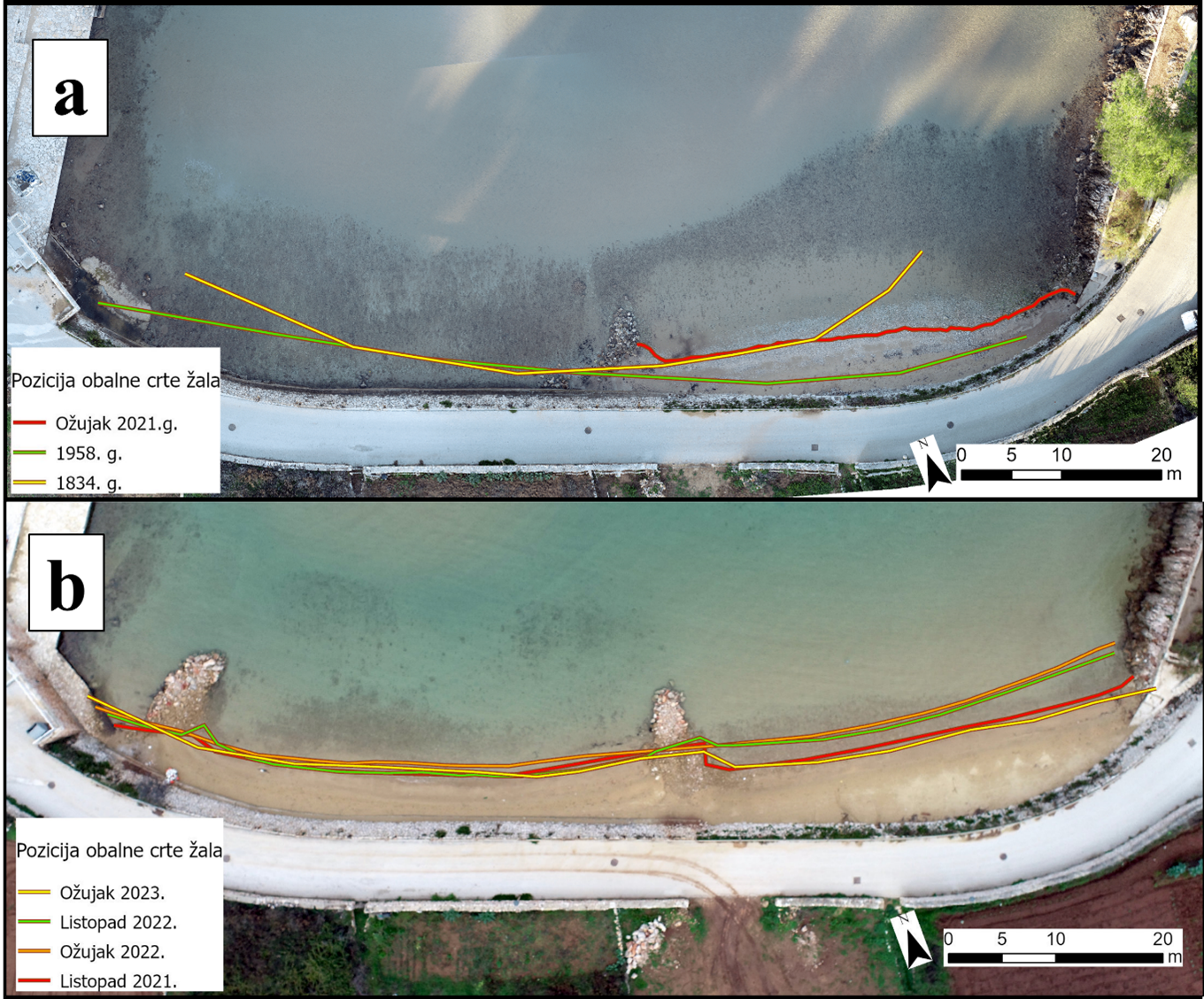 Promjene obalne crte žala Mina (Hvar) u razdoblju od 1834. do 2023. godine. Izradio: M. Mićunović