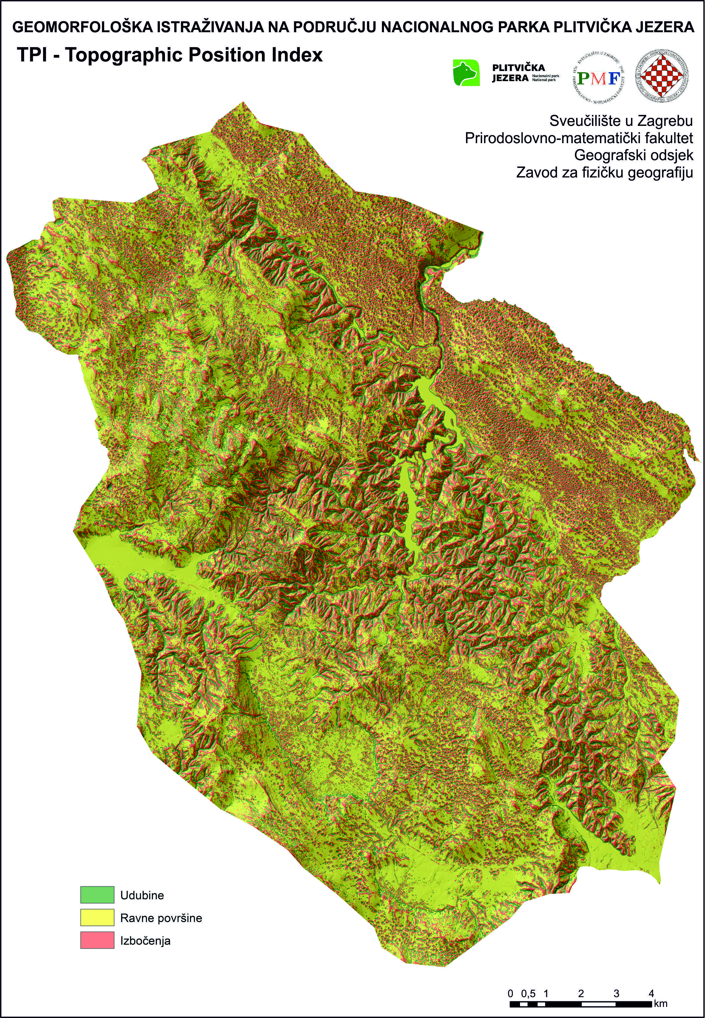 Indeks topografskog položaja (Topographic Position Index) za reljef NP Plitvička jezera. Izrađeno na temelju DMR-a rezolucije 1x1 m. Izradio: N. Bočić