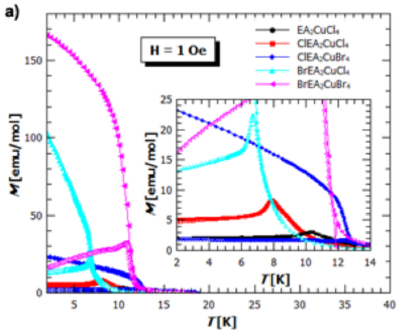 U ovom radu pripravljeni su derivati etilamonijevog tetraklorokuprata, magnetoelektričnog materijala, opće formule XEA2CuX4 (X = Cl, Br, XEA = XCH2CH2NH3+), i to mehanokemijskom reakcijom između bakrovih(II) halogenida i prikladnih amonijevih soli XEA·HX. Kristalna struktura određena difrakcijom rendgenskog zračenja na jediničnom kristalupokazuje slojevitu hibridnu arhitekturu. Magnetska svojstva tetrahalogenokuprata(II) proučavana su u temperaturnom rasponu od 2 K do 300 K. Utvrđeno je da zamjena atoma halogena u kationu, kao i halogenida u anorganskoj okosnici, značajno utječe na magnetsko uređenje. ClEA2CuCl4 je po tome sličan temeljnom spoju EA2CuCl4, a izmjeren mu je antiferomagnetski fazni prijelaz na 7,8 K. Drugi spojevi, ClEA2CuBr4, BrEA2CuBr4 i BrEA2CuCl4 ispod 12,4 K, 10,8 K, odnosno 6,7 K prelaze u složenija uređena stanja. Primijećeno je da atom broma u kationu pojačava međuslojnu feromagnetsku interakciju, dok je vrsta magnetskog uređenja uvjetovana vrstom halogenidnog iona u magnetskom sloju. BrEA2CuBr4 posjeduje feromagnetsko osnovno stanje, dok spojevi s kloretilamonijevim kationom imaju antiferomagnetsko osnovno stanje, a što je potkrijepljeno i pomoću DFT računa. Računi dipol-dipol međudjelovanja pokazali su njihov značajan doprinos magnetskoj anizotropiji, no potreban je i dodatan mehanizam kao što je spin-orbit vezanje. Metamagnetsko ponašanje spojeva koji imaju antiferomagnetsko osnovno stanje još je jedna od zanimljivosti ovih spojeva. Tako su u ovim naizgled dvodimenzionalnim magnetima u kojima su magnetski slojevi međusobno znatno udaljeni ostvarena dugodosežna magnetska uređenja zahvaljujući različitim međudjelovanjima, a tip uređenja značajno je promijenjen malom promjenom u kemijskom sastavu, koji je ustvari doveo i do različitih međudjelovanja unutar slojeva, kao i onih među slojevima.
