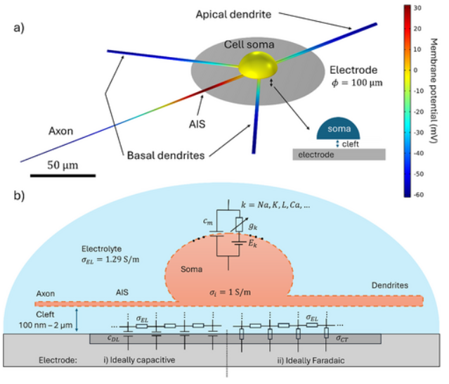 U novom radu grupe izv.prof. Vedrana Đereka objavljenom u časopisu Advanced Electronic Materials, Aleksandar Opančar i suradnici istražili su kako svojstva sučelja između mikroelektrode i elektrolita utječu na učinkovitost izvanstanične električne stimulacije neurona. U radu su uspoređena dva idealizirana tipa elektroda — kapacitivne i Faradayeve — pomoću potpuno spregnutog numeričkog modela koji povezuje metodu konačnih elemenata (FEM) s Hodgkin–Huxleyjevim opisom neuronske dinamike.